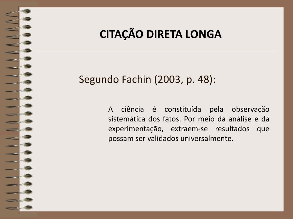 Idéias Citacao Indireta Longa. Além disso, o espaçamento entre as linhas deve ser simples. A fonte da letra deverá ser de tamanho 10, menor que o restante do texto.